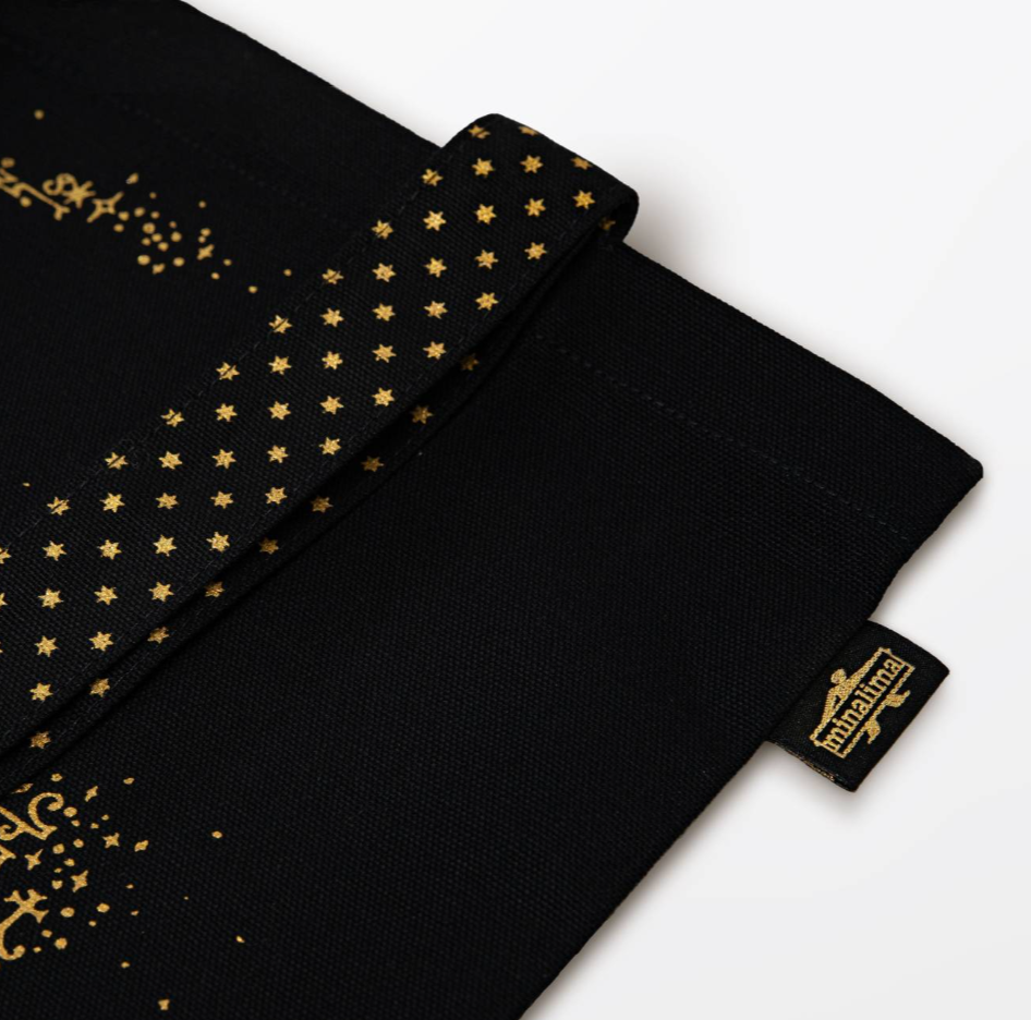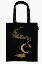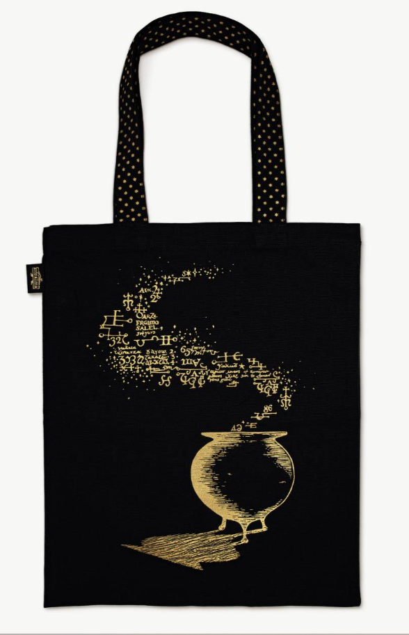 Crafted from 100% organic cotton with shimmering gold metallic detailing, it features two patterned handles and generous dimensions (42.5cm x 34.5cm) perfect for carrying a 16" laptop or your potion-making supplies.