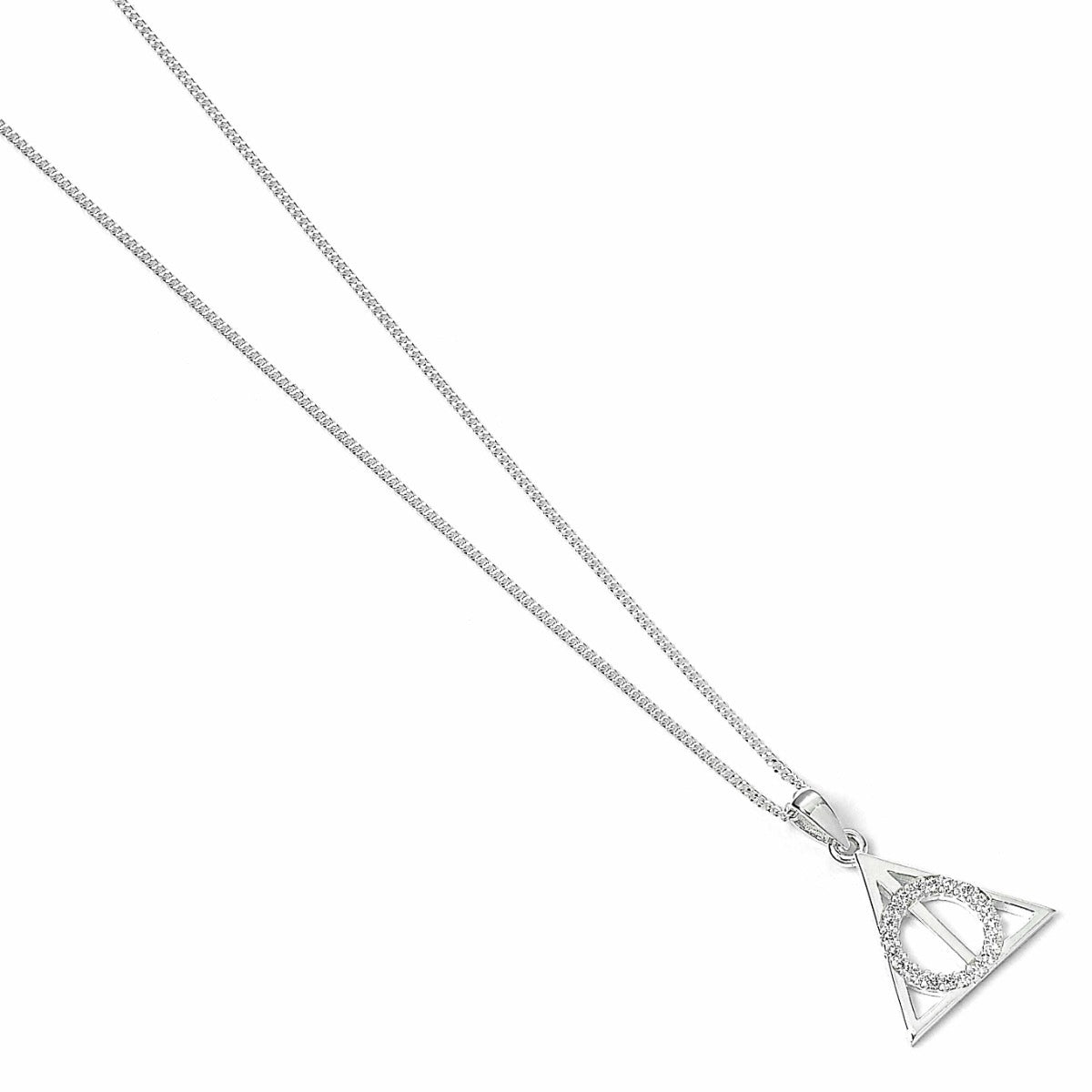 Wear a piece of wizarding magic with this enchanting Deathly Hallows necklace. The iconic symbol - representing the three most powerful items in the Wizarding World - gleams in sterling silver and sparkles with crystal elements set in elegant claw settings.