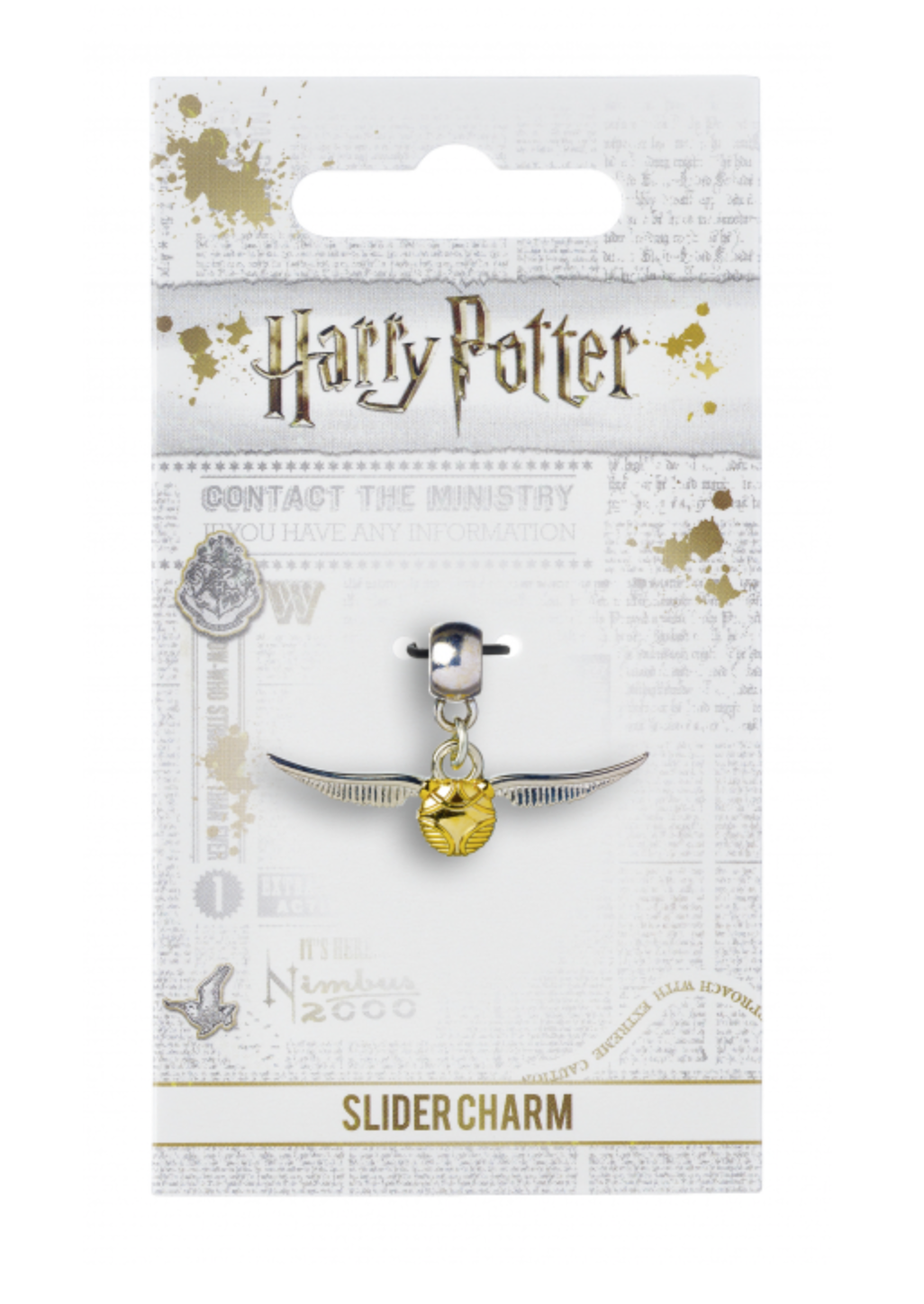 The Golden Snitch Slider Charm is silver plated and comes on a Silver Plated charm bail. This charm has been designed using the Official Warner Bros Style Guide to resembe the Golden Snitch. This Golden Snitch Charm easily slides onto Carat Shop Charm Bracelets. This Golden Snitch Charm measures 8mm x 37mm and comes presented on official Harry Potter branded card packaging and shows the Warner Bros logo on the reverse.