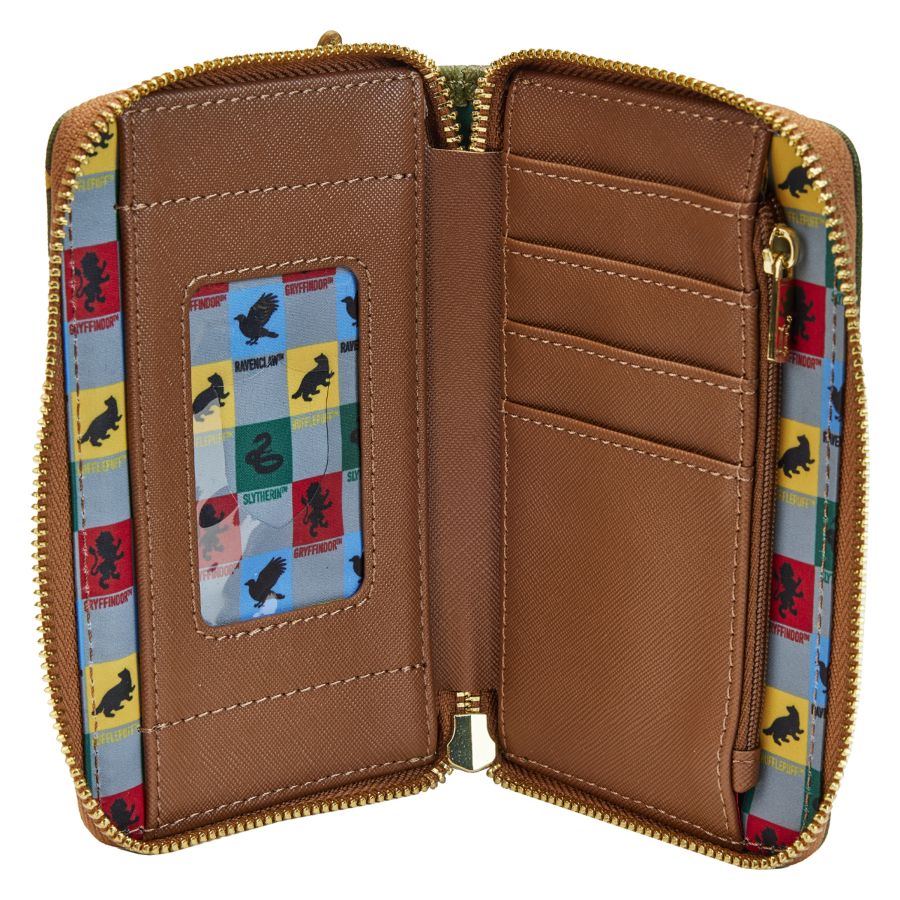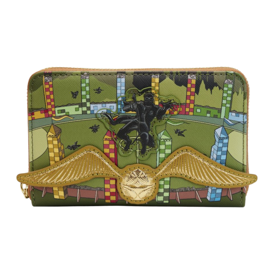 Capture the magic of Quidditch with the Golden Snitch Zip Around Purse! Featuring a shimmering gold Snitch soaring above the field, detailed with metallic, applique, and debossed accents, this wallet brings the excitement of the game to life. A Seeker on a broomstick races to catch the prize, while the back proudly displays “Quidditch” and “Hogwarts” in gold print. Inside, four card slots and a clear ID window keep your essentials organized.